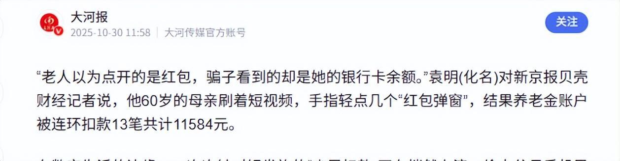 《新京报》就报道过,一位60岁的老人,在刷手机时轻轻一晃,就跳转进了“看剧领红包”的广告界面,老人还以为是真红包,殊不知那个“关注”按钮其实是“支付”伪装的,老人都没反应过来呢,就被人脸识别完成了支付,养老金被连续扣了13笔,总共11584块钱。